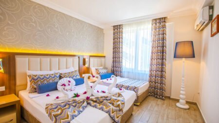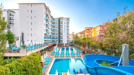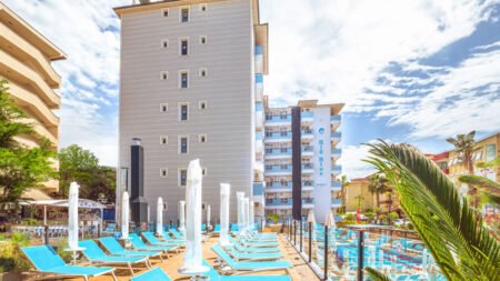 Direct naar: * Ligging () * Faciliteiten () * Restaurants & bars () * Zwembaden () * Hotelkamers () * Activiteiten & ontspanning () * Kinderfaciliteiten () * Verzorging () Ligging Club Big Blue Suite Hotel * Op ca. 500 meter van het strand * Op ca. 2,5 kilometer van het centrum van Alanya * Dichtstbijzijnde winkels, restaurants en bars op ca. 100 meter * Alanya Castle op ca. 6 kilometer * Bushalte op loopafstand Faciliteiten * 1 gebouw met maximaal 7 verdiepingen * 2 liften * 127 kamers * 24-uursreceptie * Lobby * Bagageruimte * Tuin * Wifi in de lobby * Winkeltje* * Wasservice* * Doktersservice* * Openbare parkeergelegenheid *Tegen betaling Restaurants & bars * 1 buffetrestaurant * 1 á-la-carterestaurant (vooraf reserveren en tegen betaling (bij strand of hotel) * 1 snackrestaurant * 2 bars Zwembaden * 3 buitenzwembaden, waarvan 1 met 2 glijbanen (op vaste tijden geopend) (geopend van 18-4 t/m 31-10) * Zonneterras * Ligbedden, matrasjes en parasols gratis (zwembad) * Gratis badhanddoekenservice * Ligbedden, matrasjes en parasols tegen betaling (strand) Hotelkamers * Standaardkamer (1-3 personen) * Ca. 20 m² * Telefoon* * Airconditioning * Televisie * Minibar (gevuld met water) * Kluisje* * Koffie-/theezetfaciliteiten * Wifi* * Douche * Toilet * Föhn * Balkon of terras met zitje * De voordeelkamer (2 personen) kan qua grootte, ligging, uitzicht en faciliteiten afwijken van de Standaardkamer en heeft geen balkon of terras *Tegen betaling * Superiorkamer (1-2 personen) * Ca. 21 m² * Luxer ingericht * Dezelfde faciliteiten als de Standaardkamer * Balkon of terras met zitje * Familiekamer (3-5 personen) * Ca. 33 m² * Bestaat uit 2 ruimtes zonder tussendeur * Extra bed en slaapbank * Dezelfde faciliteiten als de Standaardkamer * Familiekamer Deluxe (3-5 personen) * Ca. 33 m² * Luxer ingericht * Bestaat uit 2 ruimtes zonder tussendeur * Dezelfde faciliteiten als de Standaardkamer Activiteiten & ontspanning * Aerobics * Beachvolleybal * Darts * Biljart * Tafeltennis * Turks bad * Sauna* * Massages en behandelingen* * 2x per week entertainment * 1x per week live muziek * 1x per week een Turkse avond *Tegen betaling Kinderfaciliteiten * 1 kinderzwembad (geopend van 18-4 t/m 31-10) * Miniclub 6 dagen per week (4-12 jaar) * Speeltuin * Minidisco * Babybedjes (op aanvraag en op basis van beschikbaarheid) * Babysitservice op aanvraag en tegen betaling Verzorging Zomer: Club Big Blue Suite Hotel * Verblijf o.b.v. All Inclusive: * Ontbijt in buffetvorm (07.30-09.30 uur) * Laat ontbijt in buffetvorm (09.30-10.00 uur) * Lunch in buffetvorm (12.30-14.00 uur) * Diner in buffetvorm (19.00-21.00 uur) * Diverse snacks (15.00-16.30 uur) * Koffie/thee en koekjes (16.30-17.30 uur) * IJs (16.00-17.00 uur) * Geselecteerde lokale (non-)alcoholische dranken (11.00-23.00 uur) * Tegen betaling: import drankjes, verse vruchtensappen, speciale cognac, cocktails, en wijnen, Turkse koffie en champagne en het à-la-carterestaurant (vooraf reserveren) Extra informatie: Bij deze pakketreis is een huurauto inbegrepen, daarom vervalt de transfer van de luchthaven naar de accommodatie en vice versa. De reisleiding, aanwezig op de luchthaven, verwijst je naar het autoverhuurbedrijf en geeft je een welkomstenvelop. Is je reisgezelschap te groot voor één auto? Boek dan een tweede auto bij. Voor prijzen en beschikbaarheid kun je contact opnemen met ons Contact Center. Informatie & Voorwaarden Huurauto Alanya () Informatie & Voorwaarden Huurauto Antalya ()