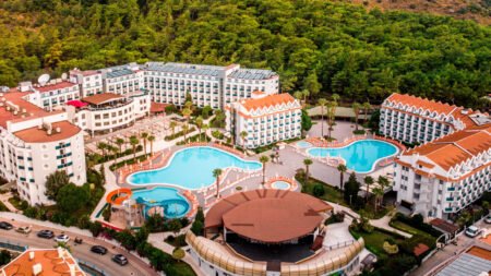 Direct naar: * Ligging () * Faciliteiten () * Restaurants & Bars () * Hotelkamers () * Sport & Ontspanning () * Kinderfaciliteiten () * Zwembaden () * Verzorging () Ligging: Green Nature Resort & Spa * Gelegen in een groen dennenbos * Op ca. 500 meter van het openbare strand * Op ca. 3 kilometer van het centrum van Marmaris * Dichtstbijzijnde winkel op ca. 500 meter * Dichtstbijzijnde restaurant en bar op ca. 800 meter * Gratis shuttleservice naar het strand (om 10.00 en 11.00 uur naar het strand en om 17.30 uur terug naar het hotel) Faciliteiten * 1 hoofdgebouw en 2 bijgebouwen met maximaal 5 verdiepingen * 7 liften * 630 kamers * 24-uursreceptie * Bagageruimte * Lobby * Tuin * Wifi * Kapsalon* * Winkeltjes en minimarkt* * Roomservice* * Doktersservice* * Wasservice* * Openbare en privé parkeergelegenheid *Tegen betaling Restaurants & bars * 2 buffetrestaurants * 1 à-la-carterestaurant (vooraf reserveren en tegen betaling) * 5 bars Hotelkamers * Clubkamer landzicht (1-2 personen) * Ca. 25 m² * Gelegen in het 'Club' gedeelte van het resort * Telefoon* * Airconditioning * Televisie * Minibar * Kluisje * Wifi * Koffie-/theezetfaciliteiten * Douche * Toilet * Föhn * Balkon met zitje *Tegen betaling * Standaardkamer Resort (1-3 personen) * Ca. 25 m² * Gelegen in het hoofdgebouw * Dezelfde faciliteiten als de Clubkamer * Familiekamer Club (3-4 personen) * Ca. 35 m² * Gelegen in het 'Club' gedeelte van het resort * Bestaat uit 2 aparte ruimtes (sommige met balkon) * Dezelfde faciliteiten als de Clubkamer * Familiekamer Resort (3-5 personen) * Ca. 35 m² * Gelegen in het hoofdgebouw * Bestaat uit 2 aparte ruimtes * Dezelfde faciliteiten als de Clubkamer Sport & Ontspanning * Fitness * Boogschieten * Tafeltennis * Voetbal * Basketbal * Volleybal * Tafelvoetbal * Voetbal * Darts * Biljart* * Gameroom* * Duikcentrum* * Watersporten aan het strand* * Turks bad * Sauna * Binnenzwembad * Massages en behandelingen* * 6 dagen per week entertainment *Tegen betaling Kinderfaciliteiten * 3 kinderzwembaden * Miniclub (4-12 jaar) * Entertainment en animatie * Minidisco * Speeltuintje * Babybedjes op aanvraag * Babysitservice op aanvraag en tegen betaling Zwembaden * 2 buitenzwembaden * 1 buitenzwembad met glijbanen (op vaste tijden geopend) * Zonneterras * Ligbedden, matrasjes en parasols gratis (zwembad en strand) * Badhanddoekenservice tegen betaling en met borg Verzorging Zomer: Green Nature Resort & Spa * Verblijf o.b.v. All Inclusive: * Ontbijt in buffetvorm (07.00-10.00 uur) * Laat ontbijt in buffetvorm (10.00-10.30 uur) * Lunch in buffetvorm (12.00-13.30 uur) * Diner in buffetvorm (18.30-21.00 uur) * Snacks (12.00-16.00 uur) * Patisserie (14.00-18.00 uur) * IJs (18.30-21.00 uur) * Nachtsnack (23.00-00.00) * Geselecteerde lokale alcoholische en alcoholvrije drankjes (10.00-00.00 uur) * Tegen betaling: import drankjes, consumpties op het strand, roomservice, alle consumpties na 00.00 uur en diner in het à-la-carterestaurant (vooraf reserveren) Extra informatie: Bij deze pakketreis is een huurauto inbegrepen, daarom vervalt de transfer van de luchthaven naar de accommodatie en vice versa. De reisleiding, aanwezig op de luchthaven, verwijst je naar het autoverhuurbedrijf en geeft je een welkomstenvelop. Is je reisgezelschap te groot voor één auto? Boek dan een tweede auto bij. Voor prijzen en beschikbaarheid kun je contact opnemen met ons Contact Center. Informatie & Voorwaarden Huurauto Marmaris (Dalaman) () Informatie & Voorwaarden Huurauto Bodrum ()