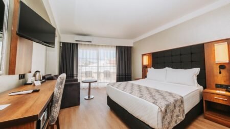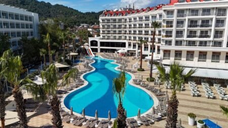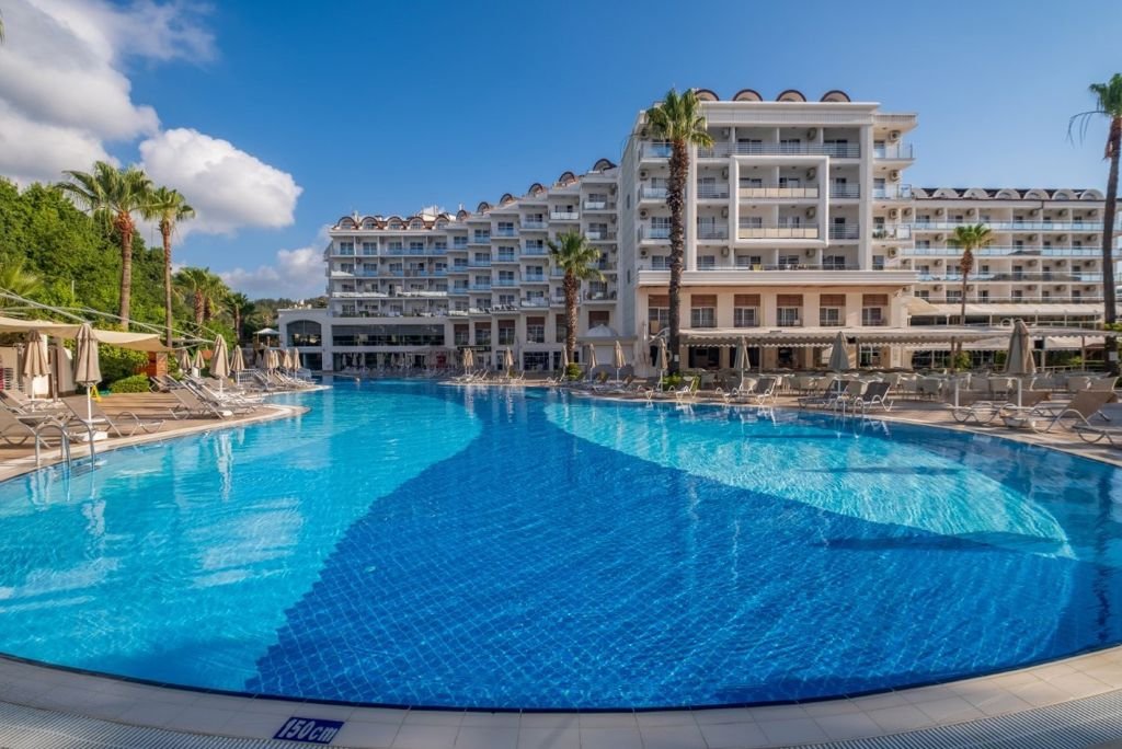 Zomer Wanneer je tussen 01-04-2026 en 31-10-2026 in deze accommodatie verblijft, is onderstaande informatie van toepassing. * Ligging * Openbaar strand Long Beach op circa 200 meter * Zandstrand * Centrum van Marmaris op circa 2 kilometer * Centrum van Icmeler op circa 8 kilometer * Dichtstbijzijnde winkel op circa 100 meter * Dichtstbijzijnde restaurant op circa 100 meter * Dichtstbijzijnde bar op circa 100 meter * Bushalte op circa 10 meter * Taxistandplaats op circa 50 meter * Algemeen & faciliteiten * 3 gebouwen * Maximaal 5 verdiepingen * 272 kamers * Receptie * 24 uur per dag * Laat uitchecken, ter plaatse aanvragen en op basis van beschikbaarheid tegen betaling * Lobby * 3 liften * Lift in elk gebouw * Bagageruimte * Doucheruimte bij aankomst en vertrek * Wifi in alle openbare ruimtes * Lage snelheid * Winkel (minimarkt) * Wasservice tegen betaling * Doktersservice tegen betaling * op aanvraag * Restaurants & bars * Buffetrestaurant * À-la-carterestaurant (vooraf reserveren) * Turks restaurant * Open tussen * Snackrestaurant * 4 drinkgelegenheden * Discobar * Koffiecorner * Lounge bar * Poolbar * Activiteiten & ontspanning * Aerobics * Biljart tegen betaling * Darts * Tafeltennis * Spa Center * Binnenzwembad * Sauna vooraf reserveren tegen betaling * Hamam vooraf reserveren tegen betaling * Massages op afspraak tegen betaling * Schoonheidsbehandelingen op afspraak tegen betaling * Kapsalon tegen betaling * Fitnessruimte * Discotheek- * Animatie voor volwassenen- * Animatie voor kinderen * Eén keer per week * Shows * Livemuziek * Eén keer per week * Zwembaden * 2 buitenzwembaden * Eén van deze zwembaden is verwarmd * Eén van deze zwembaden heeft een glijbaan * Buitenzwembad voor kinderen * Zonneterras * Ligbedden * Parasol * Badhanddoekenservice * Kinderfaciliteiten * Minidisco * Buitenspeeltuin * Verzorging * All Inclusive * Ontbijt in buffetvorm (07.00-09.30 uur) * Laat ontbijt in buffetvorm (09.30-10.00 uur) * Laat ontbijt à la carte * Lunch in buffetvorm (12.30-14.00 uur) * Diner in buffetvorm (19.00-21.00 uur) * Dineren in het à-la-carterestaurant 1 keer per verblijf * Snacks (12.30-16.00 uur) * Koffie, thee & koekjes (16.00-18.00 uur) * Middernachtsnack (23.00-00.00 uur) * Selectie lokale (non-)alcoholische drankjes (10.00-00.00 uur)Hotelkamers * 2-persoonskamer Standaard DZ * Oppervlakte circa 20 m² * Landzicht * Airconditioning * Kluisje * Satelliettelevisie * Telefoon tegen betaling * Eet- en drinkfaciliteiten * Koffie- en theefaciliteiten * Minibar * Badkamer inloopdouche, toilet, föhn en badslippers * Wifi * Balkon of terras (zitje) * 2-persoonskamer Large DL * Oppervlakte circa 24 m² * Landzicht * Airconditioning * Kluisje * Satelliettelevisie * Telefoon tegen betaling * Eet- en drinkfaciliteiten * Koffie- en theefaciliteiten * Minibar * Badkamer inloopdouche, toilet, föhn en badslippers * Wifi * Balkon of terras (zitje)
