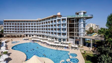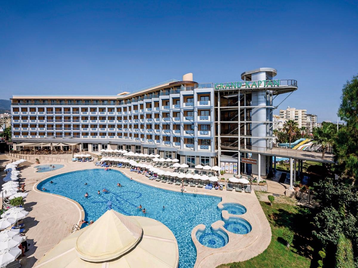 Bij Grand Kaptan aan de Turkse Riviera is het all inclusive genieten. Het 5-sterrenhotel, aan het strand en in het bruisende Alanya, is een heerlijke en luxe plek om je zonvakantie te vieren, met het hele gezin. Aan waterpret geen gebrek: er zijn maar liefst 3 waterglijbanen en twee buitenbaden. Op het zonneterras of aan het strand kun je helemaal tot rust komen, op je ligbed en onder de parasol. Of breng een bezoek aan het wellnesscentrum! Daarnaast zijn er allerlei activiteiten te doen als aerobics, fitness en beachvolleybal. En kinderen kunnen hun lol niet op in de miniclub. Omdat je verblijf bij Grand Kaptan in Alanya all inclusive is, kun je onbezorgd én onbeperkt vakantie vieren. Drink een cocktail bij de roof top bar en geniet van een geweldig uitzicht over de Turkse kust en de fonkelende zee. Wil jij ook genieten van een onbezorgde all inclusive vakantie in Turkije op een toplocatie? Boek dan snel jouw verblijf bij Grand Kaptan Hotel in Alanya!