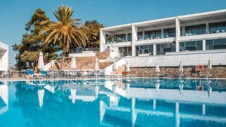Hotel Aiora Aqua Resort in het gezellige Lardos op Rhodos biedt alles voor een onvergetelijke vakantie met moderne faciliteiten en een ideale ligging. Op slechts 300 meter van het mooie zandstrand en 500 meter van het levendige centrum, is alles binnen handbereik voor een geweldige tijd. Geniet van uitgebreide eetmogelijkheden, van een gevarieerd buffetrestaurant tot authentieke Griekse gerechten en Italiaanse specialiteiten. Overdag biedt de pool bar verfrissende drankjes voor bij het zwembad en het aquapark, waar de hele familie zich kan uitleven.