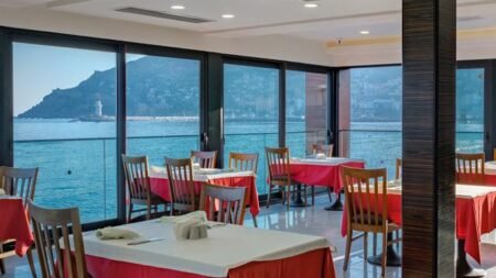 Het restaurant, waar het buffet drie keer per dag klaar staat, heeft hoge ramen en hierdoor is het uitzicht over zee en het schiereiland van Alanya hier vandaan schitterend. In de kleine ‘nomadentent’ heerlijk verse Turkse pannekoekjes gebakken, echt een aanrader om tijdens een dagje zonnen op het strand of aan het zwembad eens te proberen.