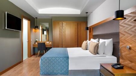 Wanneer je de imposante lobby binnenstapt, weet je het direct. Hier ga je genieten van een indrukwekkend 5 sterrenhotel in Kusadasi waar het personeel voor je klaar staat Liberty Golf & Resort. Duik het zwembad in, geniet van het entertainment, zak lekker onderuit in de gratis sauna of geniet van een Turks bad voordat je lekker gaat dineren. Dit kan trouwens ook op de 10e verdieping van het hotel. Het animatieteam tovert op ieders gezicht een glimlach. Ook het Mini Aquapark is een waar spetterfestijn. En als klapper op de vuurpijl heeft dit hotel maar liefst 7 à la carte restaurants. Hier verveel je je niet!