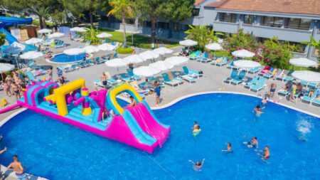 Direct naar: * Ligging () * Faciliteiten () * Restaurants & bars () * Zwembaden () * Hotelkamers () * Activiteiten & ontspanning () * Kinderfaciliteiten () * Verzorging () Ligging Master Family Club * Direct aan het privéstrand * Op ca. 20 kilometer van Manavgat * Dichtsbijzijnde restaurants, bars en winkeltjes op ca. 5 kilometer * Bushalte op ca. 50 meter Faciliteiten * 11 gebouwen met maximaal 2 verdiepingen * 292 kamers * 24-uursreceptie * Lobby * Bagageruimte * Tuin * Wifi * Roomservice* * Winkeltje en minimarkt* * Wasservice* * Doktersservice* * Kapsalon* * Openbare parkeergelegenheid *Tegen betaling Restaurants & bars * 1 buffetrestaurant * 2 à-la-carterestaurants * 5 bars Zwembaden * 2 buitenzwembaden, waarvan 1 met glijbanen * 1 binnenzwembad * Zonneterras * Privéstrand * Ligbedden, badhanddoekenservice, matrasjes en parasols gratis (zwembad en strand) Hotelkamers * Standaardkamer tuinzicht (1-3 personen) * Ca. 20 m² * Telefoon* * Airconditioning * Televisie * Minibar * Kluisje* * Koffie-/theezetfaciliteiten * Wifi* * Douche * Toilet * Föhn * Slippers * Balkon of terras met zitje * Ook boekbaar als kindvriendelijke kamer (4 personen) * Tegen een meerprijs boekbaar als swim-up kamer (2-3 personen) *Tegen betaling * Standaardkamer met stapelbed (3-4 personen) * Ca. 24 m² * Stapelbed * Tuinzicht * Dezelfde faciliteiten als de standaardkamer * Familiekamer (3-4 personen) * Ca. 26 m² * Tuinzicht * Dezelfde faciliteiten als de standaardkamer Activiteiten & ontspanning * Fitness * Aerobics * Basketbal * Beachvolleybal * Boccia * Darts * Tafelvoetbal* * Tafeltennis * Gameroom* * Watersporten aan het strand* * Turks bad * Sauna * Massages en behandelingen* * Entertainment *Tegen betaling Kinderfaciliteiten * 2 kinderzwembaden, waarvan 1 met glijbanen * Miniclub (4-12 jaar) * Speeltuin * Minidisco * Kinderentertainment * Babybedjes * Babysitservice op aanvraag en tegen betaling Verzorging Zomer: Master Family Club * Verblijf o.b.v. All Inclusive: * Ontbijt in buffetvorm (07.00-10.00 uur) * Laat ontbijt in buffetvorm (10.00-10.30 uur) * Lunch in buffetvorm (12.30-14.00 uur) * Diner in buffetvorm (19.00-21.00 uur) * Diverse snacks (12.00-16.00 uur) * Koffie/thee en koekjes (16.00-17.00 uur) * IJs (16.30-17.00 uur) * Middernachtsnack (23.00-00.00 uur) * Geselecteerde lokale (non-)alcoholische dranken en een selectie import dranken (10.00-00.00 uur)