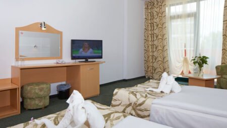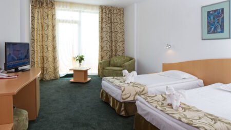 Zomer Wanneer je tussen 24-05-2026 en 20-09-2026 in deze accommodatie verblijft, is onderstaande informatie van toepassing. * Ligging * Openbaar strand op circa 250 meter * Zandstrand * Lunapark op circa 200 meter * Aquapark op circa 3 kilometer * Sunny Beach op circa 400 meter * Nesebar op circa 3,5 kilometer * Shuttleservice naar Aquapark gratis * Bushalte op circa 300 meter * Algemeen & faciliteiten * 2 gebouwen * Maximaal 6 verdiepingen * 210 kamers * Receptie * 24 uur per dag * Lobby * 4 liften * Lift in elk gebouw * Bagageruimte * Wifi in alle openbare ruimtes * Doktersservice tegen betaling * op aanvraag * Privé parkeergelegenheid tegen betaling * Restaurants & bars * Buffetrestaurant * 3 drinkgelegenheden * Bar * Lobbybar * Poolbar * Activiteiten & ontspanning * Biljart tegen betaling * Darts * Fitness * Midgetgolf * Spafaciliteiten * Sauna tegen betaling * Massages tegen betaling * Shows * 3 keer per week * Livemuziek * 6 keer per week * Zwembaden * Buitenzwembad * Buitenzwembad voor kinderen * Binnenzwembad * Glijbaan * Zonneterras * Ligbedden met matrasjes * Parasol * Kinderfaciliteiten * Mini club (4-12 jaar) * Minidisco * Buitenspeeltuin * Babybedje als preferentie toe te voegen in het boekingsformulier * Verzorging * All Inclusive * Ontbijt in buffetvorm (07.30-10.00 uur) * Lunch in buffetvorm (12.30-14.00 uur) * Diner in buffetvorm (18.30-20.30 uur) * Snacks (15.30-17.30 uur) * Koffie, thee & koekjes (07.30-20.30 uur) * IJs (15.30-17.30 uur) * Selectie lokale (non-)alcoholische drankjes (10.00-22.00 uur)Hotelkamers * 2-persoonskamer Standaard DZ * Oppervlakte tussen 21 en 25 m² * Airconditioning * Kluisje * Televisie * Telefoon tegen betaling * Eet- en drinkfaciliteiten * Koelkast * Badkamer douche, toilet en föhn * Balkon of terras (zitje) * 2-persoonskamer Standaard Zwembadzicht DZP * Oppervlakte tussen 21 en 25 m² * Zwembadzicht * Airconditioning * Kluisje * Televisie * Telefoon tegen betaling * Eet- en drinkfaciliteiten * Koelkast * Badkamer douche, toilet en föhn * Balkon of terras (zitje) * 2-persoonskamer Deluxe DD * Oppervlakte tussen 31 en 35 m² * Airconditioning * Kluisje * Televisie * Telefoon tegen betaling * Eet- en drinkfaciliteiten * Koelkast * Badkamer douche, toilet en föhn * Balkon of terras (zitje) * 2-persoonskamer Large DL * Oppervlakte tussen 26 en 30 m² * Airconditioning * Kluisje * Televisie * Telefoon tegen betaling * Eet- en drinkfaciliteiten * Koelkast * Badkamer douche, toilet en föhn * Balkon of terras (zitje)