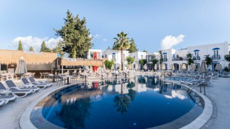 Zomer Wanneer je tussen 18-04-2026 en 31-10-2026 in deze accommodatie verblijft, is onderstaande informatie van toepassing. * Ligging * Openbaar strand op circa 200 meter * Centrum van Bitez op circa 500 meter * Dichtstbijzijnde winkel op circa 250 meter * Dichtstbijzijnde restaurant op circa 250 meter * Dichtstbijzijnde bar op circa 250 meter * Bodrum op circa 6 kilometer * Bushalte (op loopafstand) * Algemeen & faciliteiten * 12 gebouwen * Maximaal 2 verdiepingen * 104 kamers * Receptie * 24 uur per dag * Lobby * Geen liften * Bagageruimte * Wifi in alle openbare ruimtes * Tuin * Openbare parkeergelegenheid * Restaurants & bars * Buffetrestaurant * À-la-carterestaurant tegen bijbetaling * 2 drinkgelegenheden * 2 bars * Activiteiten & ontspanning * Darts * Tafeltennis * Zwembaden * 2 buitenzwembaden * Eén van deze zwembaden heeft een glijbaan * 2 buitenzwembaden voor kinderen * Eén van deze zwembaden heeft een glijbaan * Zonneterras * Ligbedden met matrasjes * Parasol * Badhanddoekenservice * Kinderfaciliteiten * Buitenspeeltuin * Babybedje * Babysitservice tegen betaling * Verzorging * All Inclusive * Ontbijt in buffetvorm (08.00-10.00 uur) * Laat ontbijt in buffetvorm (10.00-10.30 uur) * Lunch in buffetvorm (12.30-14.00 uur) * Diner in buffetvorm (19.30-21.30 uur) * Snacks (14.30-17.00 uur) * Koffie, thee & koekjes (17.00-18.00 uur) * IJs (15.00-16.30 uur) * Middernachtsnack (23.30-00.30 uur) * Selectie lokale (non-)alcoholische drankjes (10.00-00.00 uur) * Tegen betaling: import drankjesHotelkamers * 2-persoonskamer Standaard DZ * Oppervlakte circa 24 m² * Op de begane grond * Airconditioning * Televisie * Telefoon tegen betaling * Eet- en drinkfaciliteiten * Mini koelkast * Badkamer douche, toilet en föhn * Balkon of terras (zitje) * Familiekamer Standaard FZ * Oppervlakte circa 36 m² * Op de eerste verdieping * Woon-/slaapkamer * Eén slaapkamer * Airconditioning * Televisie * Telefoon tegen betaling * Eet- en drinkfaciliteiten * Mini koelkast * Badkamer douche, toilet en föhn * Balkon of terras (zitje)