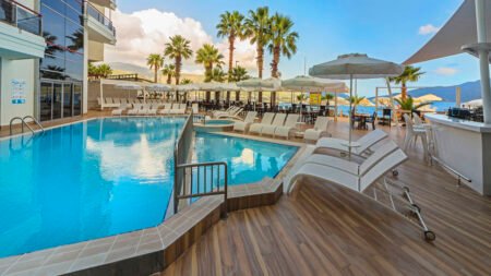 Direct naar: * Ligging () * Faciliteiten () * Restaurants & bars () * Zwembaden () * Hotelkamers () * Activiteiten & ontspanning () * Verzorging () * Ligging Poseidon * Op ca. 2 kilometer van Marmaris * Direct aan het strand en boulevard * Kasteel van Marmaris en Netsel Marina op ca. 2,5 kilometer * Op ca. 200 meter van winkeltjes * Only Adult hotel; 16+ Faciliteiten * 1 gebouw met maximaal 6 verdiepingen * 2 liften * 232 kamers * 24-uursreceptie * Lobby * Bagageruimte * Wifi in de openbare ruimtes * Doktersservice* *Tegen betaling Restaurants & bars * 1 buffetrestaurant * 2 bars Zwembaden * 1 buitenzwembad * 1 binnenzwembad * Zonneterras * Privéstrand * Ligbedden, matrasjes en parasols gratis (zwembad en strand) * Badhanddoekenservice* (zwembad) *Tegen betaling Hotelkamers * Standaardkamer met landzicht (1-2 personen) * Ca. 16 m² * Telefoon* * Airconditioning (centraal geregeld) * Televisie * Minibar (gevuld met 2 flessen water) * Kluisje* * Koffie-/theezetfaciliteiten * Wifi * Inloopdouche * Toilet * Föhn * Slippers * Balkon of terras met zitje * Landzicht * Tegen een meerprijs boekbaar met zijzeezicht (ca. 16 m², voorzien van bedbank, 1-3 pers.) * De voordeelkamer (ca. 12 m², 2-3 pers.) kan qua ligging en faciliteiten afwijken van de standaarkamer met landzicht *Tegen betaling * Standaardkamer direct zeezicht (2 personen) * Ca. 16 m² * Minibar * Direct zeezicht * Dezelfde faciliteiten als de standaardkamer met landzicht Activiteiten & ontspanning * Fitness/gym * Aerobics * Yoga * Darts * Tafelvoetbal * Biljart* * Tafeltennis * Watersporten aan het strand* * Turks bad * Sauna * Binnenzwembad * Bubbelbad * Massages en behandelingen* * 1x per week livemuziek *Tegen betaling Verzorging Zomer: Poseidon * Verblijf o.b.v. All Inclusive: * Ontbijt in buffetvorm (07.00-10.00 uur) * Laat ontbijtbuffet, beperkt (10.00-10.30 uur) * Lunch in buffetvorm (12.30-14.00 uur) * Diner in buffetvorm (18.45-20.45 uur) * Fruit (15.00-16.00 uur) * Snackbar (12.00-15.00 uur) * Koffie/thee en koekjes (16.00-17.00 uur) * Middernachtsoep/-snackbuffet (23.00-00.00 uur) * Lokale (non-)alcoholische dranken (10.00-23.00 uur) * Tegen betaling: import drankjes, roomservice, espresso, cocktails, vers vruchtensap, ijs, Turkse koffie en het à-la-carterestaurant