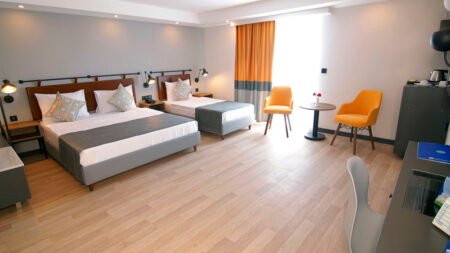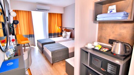 Zomer Wanneer je tussen 27-03-2026 en 07-11-2026 in deze accommodatie verblijft, is onderstaande informatie van toepassing. * Ligging * In het centrum van Alanya * Openbaar strand Kleopatra beach op circa 600 meter * Dichtstbijzijnde winkel op circa 20 meter * Dichtstbijzijnde restaurant op circa 20 meter * Shuttleservice naar het strand * Bushalte op circa 20 meter * Algemeen & faciliteiten * 1 gebouw * Maximaal 9 verdiepingen * 85 kamers * Receptie * 24 uur per dag * Lobby * 2 liften * Bagageruimte * Wifi in alle openbare ruimtes * Wasservice tegen betaling * Doktersservice tegen betaling * Openbare parkeergelegenheid * Restaurants & bars * Buffetrestaurant * Drinkgelegenheid * Poolbar * Activiteiten & ontspanning * Fitness * Spa Center * Binnenzwembad * Sauna tegen betaling * Hamam * Massages tegen betaling * Animatie * 2 keer per week * Shows * 2 keer per week * Zwembaden * Buitenzwembad * Buitenzwembad voor kinderen * Binnenzwembad * Zonneterras * Ligbedden * Parasol * Badhanddoekenservice * Verzorging * All Inclusive * Ontbijt in buffetvorm (07.30-09.30 uur) * Laat ontbijt in buffetvorm (09.30-10.00 uur) * Lunch in buffetvorm (12.30-14.00 uur) * Diner in buffetvorm (18.30-20.30 uur) * Koffie, thee & koekjes (16.00-17.00 uur) * Selectie lokale (non-)alcoholische drankjes (10.00-00.00 uur) * Tegen betaling: IJs, import drankjes, turkse koffie en verse vruchtensappenHotelkamers * 2-persoonskamer Standaard DZ * Oppervlakte van circa 23 m² * Airconditioning * Kluisje tegen betaling * Televisie * Telefoon tegen betaling * Eet- en drinkfaciliteiten * Koffie- en theefaciliteiten * Minibar * Gevuld met water * Badkamer douche, toilet en föhn * Wifi * Balkon (zitje)