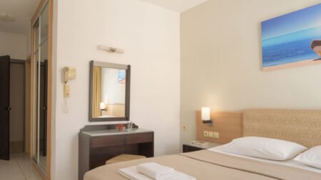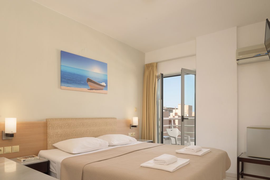 Zomer Wanneer je tussen 01-05-2026 en 31-10-2026 in deze accommodatie verblijft, is onderstaande informatie van toepassing. * Ligging * Openbaar strand op circa 250 meter * Zandstrand * Kiezelstrand * Centrum van Chersonissos op circa 150 meter * Dichtstbijzijnde winkel op circa 150 meter * Dichtstbijzijnde restaurant op circa 150 meter * Dichtstbijzijnde bar op circa 150 meter * Hersonissos op circa 150 meter * Bushalte op circa 150 meter * Taxistandplaats op circa 150 meter * Algemeen & faciliteiten * 2 gebouwen * Maximaal 5 verdiepingen * 98 kamers * Receptie * 24 uur per dag * Inchecken vanaf 15.00 uur * Uitchecken tot 11.00 uur * Lobby * 2 liften * Bagageruimte * Wifi in alle openbare ruimtes * Wasservice tegen betaling * Doktersservice tegen betaling * Tuin * Openbare parkeergelegenheid * Restaurants & bars * Buffetrestaurant * Meerdere drinkgelegenheden * Lobbybar * Poolbar * Activiteiten & ontspanning * Biljart tegen betaling * Tafeltennis * Shows * 2 keer per week * Zwembaden * Buitenzwembad * Zoetwater * Zonneterras * Ligbedden * Badhanddoekenservice tegen betaling * Verzorging * All Inclusive * Ontbijt in buffetvorm (07.30-10.00 uur) * Lunch in buffetvorm (12.30-14.30 uur) * Diner in buffetvorm (18.30-21.30 uur) * Snacks (11.00-18.00 uur) * Koffie, thee & koekjes (16.30-18.00 uur) * IJs (12.30-21.00 uur) * Selectie lokale (non-)alcoholische drankjes (11.00-23.00 uur)Hotelkamers * 2-persoonskamer Standaard DZ * Oppervlakte circa 20 m² * Landzicht * Straatzicht * Airconditioning * Kluisje tegen betaling * Televisie * Telefoon * Eet- en drinkfaciliteiten * Koelkast * Badkamer douche, toilet en föhn * Wifi * Balkon of terras (zitje)