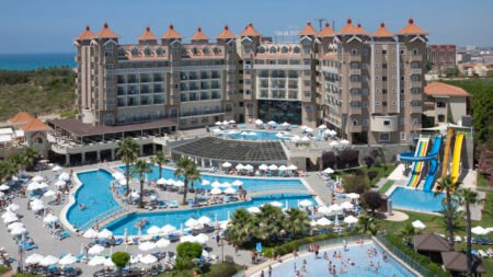 Zomer Wanneer je tussen 28-03-2026 en 07-11-2026 in deze accommodatie verblijft, is onderstaande informatie van toepassing. * Ligging * Openbaar strand Kumkoy op circa 400 meter * Privégedeelte van de accommodatie * Ligbedden met matrasjes * Parasol * Centrum van Kümkoy op circa 200 meter * Centrum van Side op circa 5 kilometer * Dichtstbijzijnde winkel op circa 200 meter * Dichtstbijzijnde restaurant op circa 200 meter * Dichtstbijzijnde bar op circa 200 meter * Side op circa 5 kilometer * Shuttleservice naar het strand * Bushalte op circa 200 meter * Algemeen & faciliteiten * 2 gebouwen * Maximaal 6 verdiepingen * 320 kamers * Receptie * 24 uur per dag * Lobby * 3 liften * Niet in elk gebouw een lift * Bagageruimte * Wifi in alle openbare ruimtes * 3 winkels * Minimarkt * Wasservice tegen betaling * Doktersservice tegen betaling * Tuin * Openbare parkeergelegenheid * Op basis van de beschikbaarheid ter plaatse * Privé parkeergelegenheid * Op basis van de beschikbaarheid ter plaatse * Restaurants & bars * Buffetrestaurant * À-la-carterestaurant * Snackbar * Roomservice tegen betaling * 7 drinkgelegenheden * 4 bars * Beachbar * Lobbybar * Poolbar * Activiteiten & ontspanning * Beachvolleybal * Biljart tegen betaling * Boccia * Boogschieten * Darts * Fitness * Tafeltennis * Voetbal * Watersporten tegen betaling * Spa Center toegang tegen betaling * Sauna tegen betaling * Turks stoombad tegen betaling * Massages tegen betaling * Schoonheidsbehandelingen tegen betaling * Gameroom toegang tegen betaling * Animatie * 7 keer per week * Zwembaden * 4 buitenzwembaden * Golfslagbad * Eén van deze zwembaden heeft 5 glijbanen * Buitenzwembad voor kinderen * 2 glijbanen * Binnenzwembad * Gesloten tussen ca. vrijdag 1 mei 2026 en woensdag 14 oktober 2026 * Zonneterras * Ligbedden met matrasjes * Parasol * Badhanddoekenservice * Kinderfaciliteiten * Midiclub (8-12 jaar) * 7 keer per week * Minidisco * Buitenspeeltuin * Babybedje als preferentie toe te voegen in het boekingsformulier * Verzorging * All Inclusive * Ontbijt in buffetvorm (07.30-10.00 uur) * Laat ontbijt in buffetvorm (10.00-11.00 uur) * Lunch in buffetvorm (12.30-14.00 uur) * Diner in buffetvorm (19.00-21.00 uur) * Snacks (12.00-15.00 uur) * Koffie, thee & koekjes (16.00-17.00 uur) * IJs (16.00-17.00 uur) * Selectie lokale (non-)alcoholische drankjes (10.00-00.00 uur) * Tegen betaling: alle consumpties in één van de bars, import drankjes, cocktails, champagne, verse vruchtensappen en roomserviceHotelkamers * 2-persoonskamer Bijgebouw DX * Oppervlakte circa 18 m² * In het bijgebouw * Airconditioning * Kluisje tegen betaling * Satelliettelevisie * Telefoon tegen betaling * Eet- en drinkfaciliteiten * Koffie- en theefaciliteiten * Minibar tegen betaling * Badkamer douche, toilet en föhn * Wifi * Balkon (zitje) * 2-persoonskamer Standaard DZ * Oppervlakte circa 22 m² * In het hoofdgebouw * Airconditioning * Kluisje tegen betaling * Satelliettelevisie * Telefoon tegen betaling * Eet- en drinkfaciliteiten * Koffie- en theefaciliteiten * Minibar tegen betaling * Badkamer douche, toilet en föhn * Wifi * Balkon (zitje) * 2-persoonskamer Large DL * Oppervlakte circa 25 m² * In het hoofdgebouw * Airconditioning * Kluisje tegen betaling * Satelliettelevisie * Telefoon tegen betaling * Eet- en drinkfaciliteiten * Koffie- en theefaciliteiten * Minibar tegen betaling * Badkamer douche, toilet en föhn * Wifi * Balkon (zitje) * Familiekamer Standaard FZ * Oppervlakte circa 31 m² * In het hoofdgebouw * Twee standaardkamers met tussendeur * Airconditioning * Kluisje tegen betaling * Satelliettelevisie * Telefoon tegen betaling * Eet- en drinkfaciliteiten * Koffie- en theefaciliteiten * Minibar tegen betaling * Badkamer douche, toilet en föhn * Wifi * Balkon (zitje)