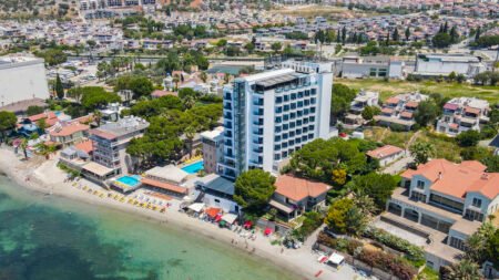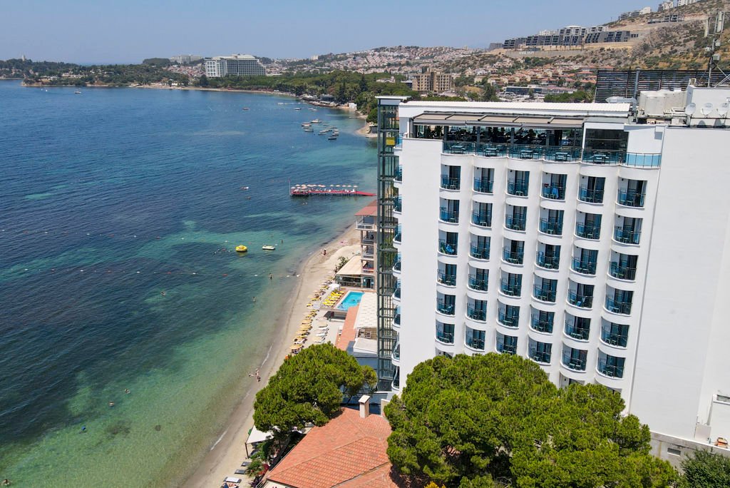 Zomer Wanneer je tussen 01-04-2026 en 01-11-2026 in deze accommodatie verblijft, is onderstaande informatie van toepassing. * Ligging * Gelegen aan het privéstrand * Ligbedden met matrasjes * Parasol * Strandhanddoekenservice * Openbaar strand Long Beach Kusadasi op circa 1,5 kilometer * Centrum van Centrum Kusadasi op circa 7,0 kilometer * Algemeen & faciliteiten * 1 gebouw * Maximaal 11 verdiepingen * 111 kamers * Receptie * 24 uur per dag * Lobby * Meerdere liften * Wifi in alle openbare ruimtes * Winkel * Wasservice tegen betaling * Doktersservice tegen betaling * Openbare parkeergelegenheid * Restaurants & bars * Buffetrestaurant * Snackbar * Roomservice tegen betaling * 2 drinkgelegenheden * 2 bars * Activiteiten & ontspanning * Fitness * Spafaciliteiten * Sauna * Turks stoombad * Massages tegen betaling * Schoonheidsbehandelingen tegen betaling * Livemuziek * Zwembaden * Binnenzwembad * Verwarmd * Binnenzwembad voor kinderen * Zonneterras * Ligbedden met matrasjes * Badhanddoekenservice * Kinderfaciliteiten * Babybedje als preferentie toe te voegen in het boekingsformulier * Babysitservice tegen betaling * ter plaatse op aanvraag * Verzorging * All Inclusive * Ontbijt in buffetvorm (07.00-10.00 uur) * Lunch in buffetvorm (12.30-14.30 uur) * Diner in buffetvorm (19.30-21.30 uur) * Snacks (12.30-16.00 uur) * Koffie, thee & koekjes (17.00-18.00 uur) * Middernachtsnack (23.30-00.00 uur) * Selectie lokale (non-)alcoholische drankjes (10.00-00.00 uur) * Tegen betaling: import drankjes en roomserviceHotelkamers * 2-persoonskamer Voordeel DE * Speciaal tarief * Locatie, formaat, uitzicht en/of faciliteiten kunnen afwijken ten opzichte van andere kamertypes * Oppervlakte van circa 22 m² * Airconditioning * Kluisje * Televisie * Telefoon tegen betaling * Eet- en drinkfaciliteiten * Koffie- en theefaciliteiten * Minibar * Badkamer inloopdouche, toilet, föhn en badslippers * Wifi * Balkon (zitje) * 2-persoonskamer Deluxe (Corner) DD1 * Oppervlakte van circa 22 m² * Airconditioning * Kluisje * Televisie * Telefoon tegen betaling * Eet- en drinkfaciliteiten * Koffie- en theefaciliteiten * Minibar * Badkamer inloopdouche, toilet, föhn en badslippers * Wifi * Balkon (zitje) * 2-persoonskamer Deluxe Zeezicht DDM * Oppervlakte van circa 22 m² * Zeezicht * Airconditioning * Kluisje * Televisie * Telefoon tegen betaling * Eet- en drinkfaciliteiten * Koffie- en theefaciliteiten * Minibar * Badkamer inloopdouche, toilet, föhn en badslippers * Wifi * Balkon (zitje) * Junior suite Standaard JZ * Oppervlakte van circa 22 m² * Zeezicht * Zijzeezicht * Airconditioning * Kluisje * Televisie * Telefoon tegen betaling * Eet- en drinkfaciliteiten * Koffie- en theefaciliteiten * Minibar * Badkamer inloopdouche, toilet, föhn en badslippers * Wifi * Balkon (zitje)
