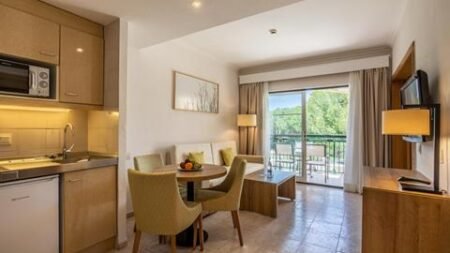 Wat een geluksvogels zijn kinderen als ze logeren in Aparthotel Zafiro Menorca. Met zo’n lekker schoon huisje en zoveel te doen is vakantie vieren hier kinderspel. Dus vis snel de zwemspullen uit de koffer en ga op ontdekkingstocht over het palmenrijke terrein. Wat opvalt is de ruimte om te rennen en te ravotten. Met als klap op de vuurpijl 2 kinderbaden inclusief cool piratenschip en iedere dag dolle animatiepret. Kinderen blij, jij blij! Kidsproof betekent ook zandstrand dichtbij, leuke haven om de hoek en een aanlokkelijke All Inclusive. Onbeperkt ijsjes eten, de smaak van zon proeven en nippen aan sangria met tinkelende ijsklontjes, wie wil dat nu niet?